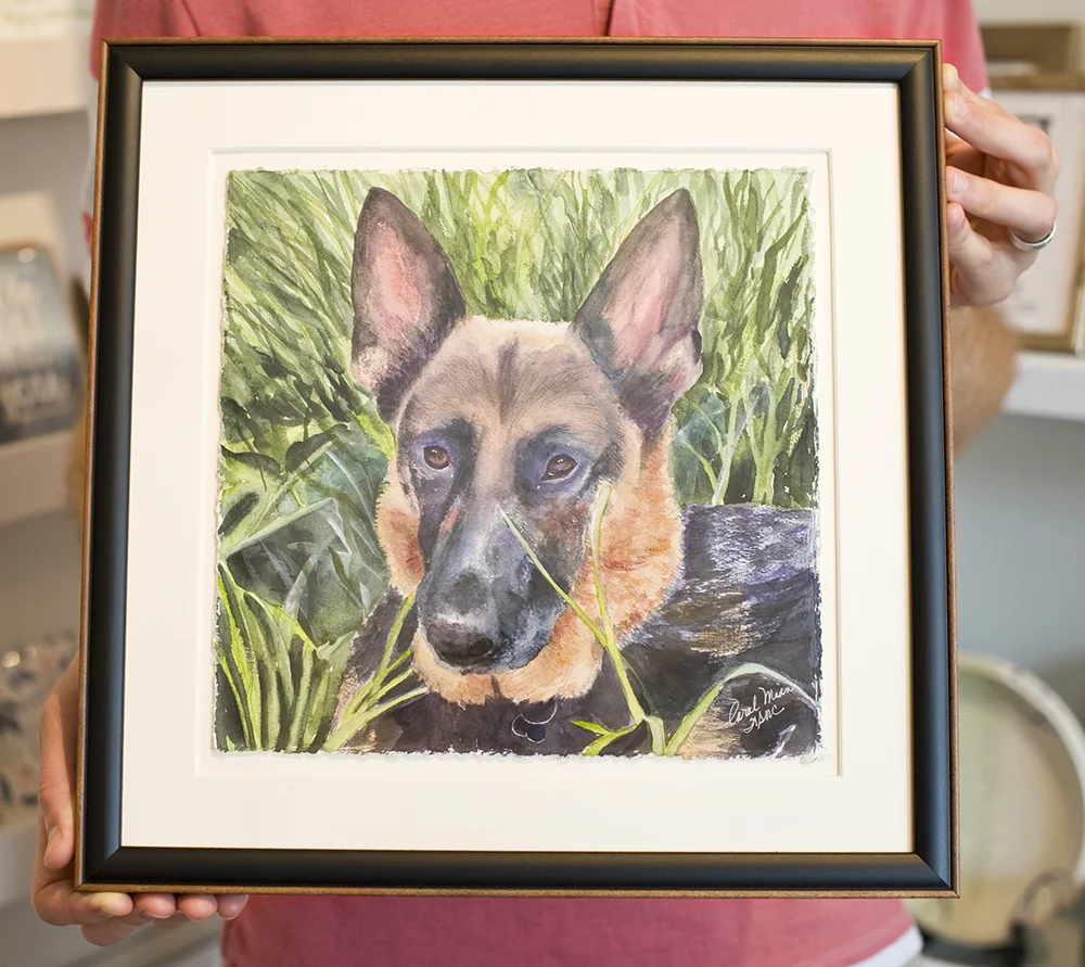 A clean and classic black and gold frame and floating mat contrast with the textural, raw-edged watercolor paper of this lovely pet portrait by Carol Mann (of Lemonade Art Gallery).