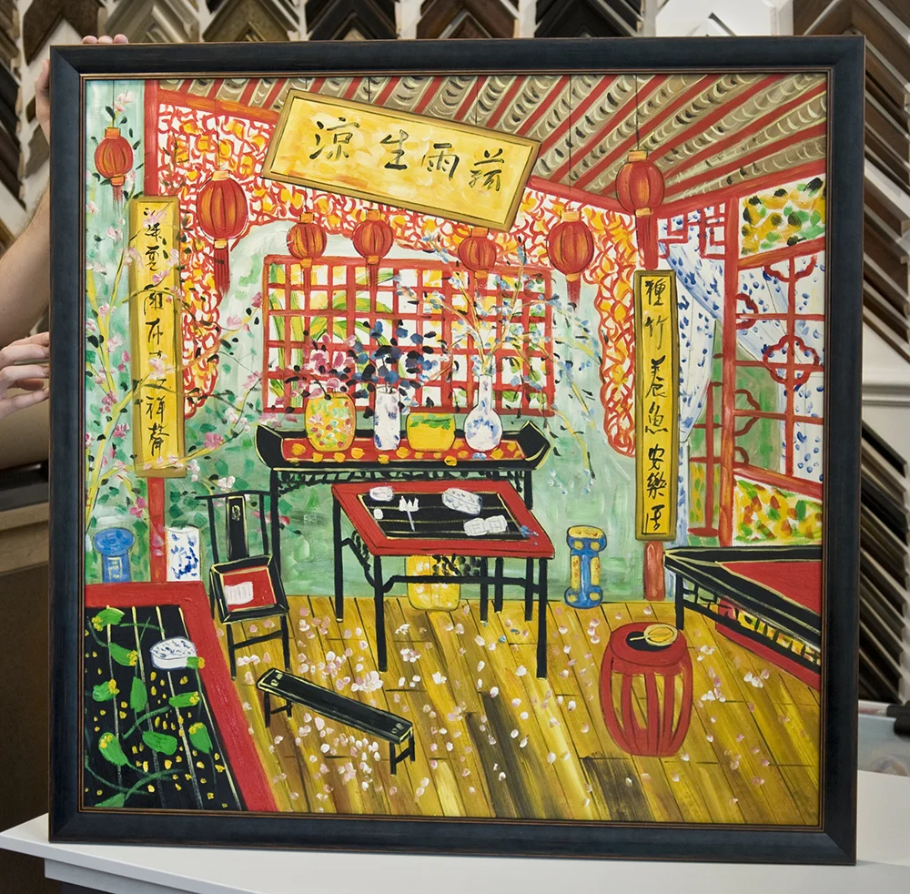 This original painting (on canvas) was rolled up, and brought all the way from China. Now it's stretched, and framed, and ready to hang. Anyone need a canvas stretched? We're happy to help :)